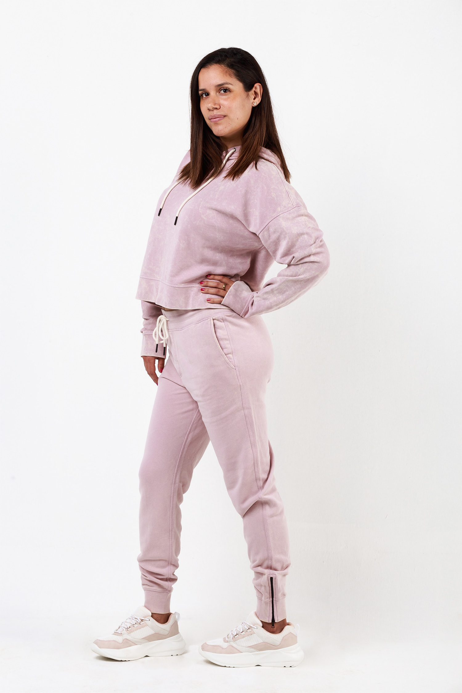 Conjunto hecho en French Terry con efecto especial de teñido vintage y cierres metálicos.
